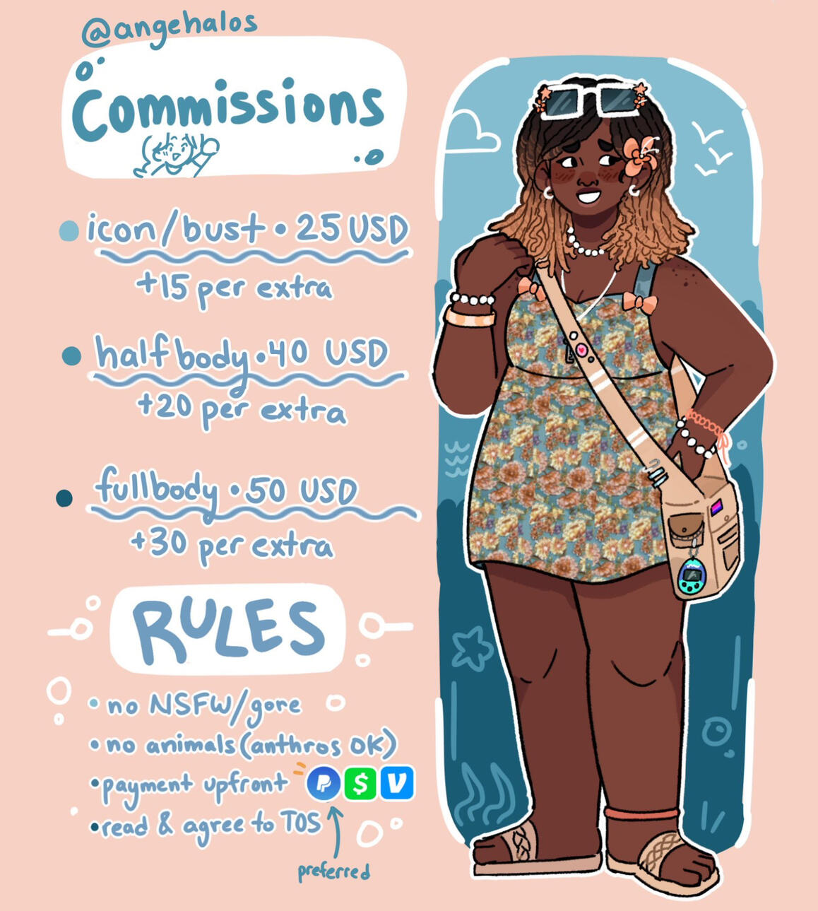 • the above rates are for personal use only; commercial rates by request• i take payment upfront for all commissions, and i accept payment through paypal, zelle, cashapp, and venmo• i will make as many adjustments as you like during the sketch phase, but i'll only make adjustments once to the final image• i will NOT draw: NSFW, "feral" furries. i otherwise reserve the right to reject a commission as i see fit.• if you're curious about a commission or something you want but may not see on my rates list, please shoot me a message and i can do my best to give you a quote! (ex. commission in a non-standard art style like chibi or steven universe)